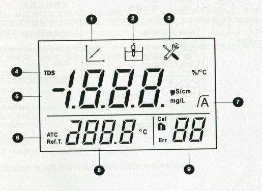 ④TDS因子設(shè)置或參數(shù)設(shè)置 ⑤電導(dǎo)率/TDS讀數(shù)或電極常數(shù) ⑥自動溫度補償